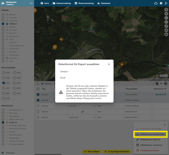 GeoJSON: Geodaten - Dieser Typ eignet sich z. B. für den Upload auf der EUDR-Plattform. Bitte beachten Sie, dass dieser Datensatz lediglich die Geometrien enthält. Die zugehörigen Sachdaten entnehmen Sie bitte dem Excel-Export.