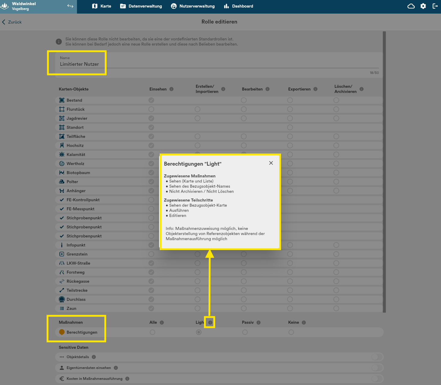 Welche Rechte haben die bestehenden Rollen in Dynamic Forest?
