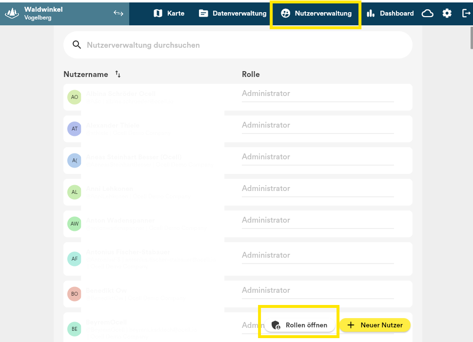 Die Rechte lassen sich in der Nutzerverwaltung einsehen. Klicken Sie dazu unten rechts auf „Rollen öffnen“ und wählen Sie anschließend die gewünschte Rolle aus.