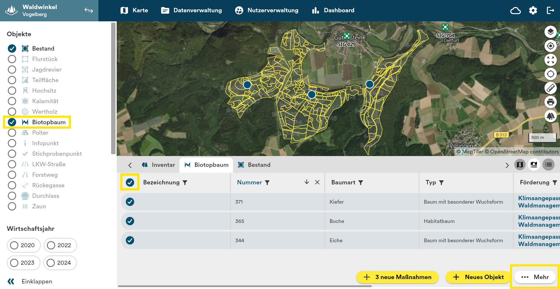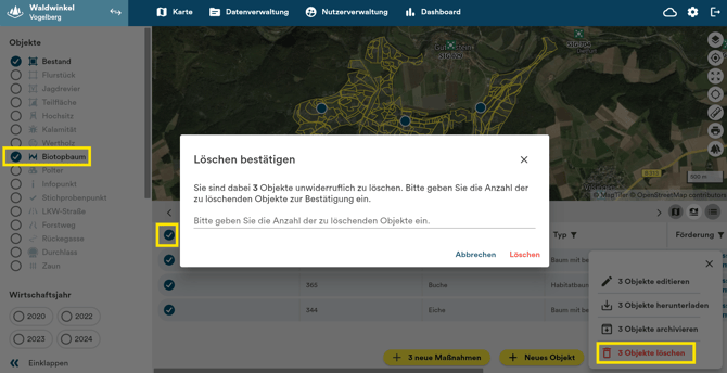 Desktopversion: Objekte oder Maßnahmen können auf der Karte oder Tabelle ausgewählt und über den Button „Mehr“ rechts unten archiviert oder gelöscht werden. Mehrfachauswahl ist ebenfalls möglich.