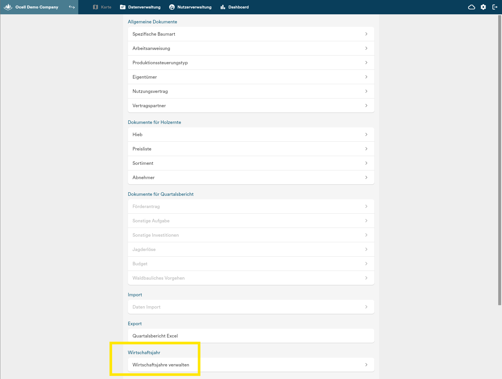 Navigieren Sie auf der Unternehmensebene zu Datenverwaltung > Wirtschaftsjahre verwalten und klicken Sie auf „Wirtschaftsjahr hinzufügen“. Bitte beachten Sie, dass dafür Adminrechte auf Unternehmensebene erforderlich sind. Falls Sie diese nicht haben, wenden Sie sich an eine entsprechend berechtigte Person in Ihrem Unternehmen.