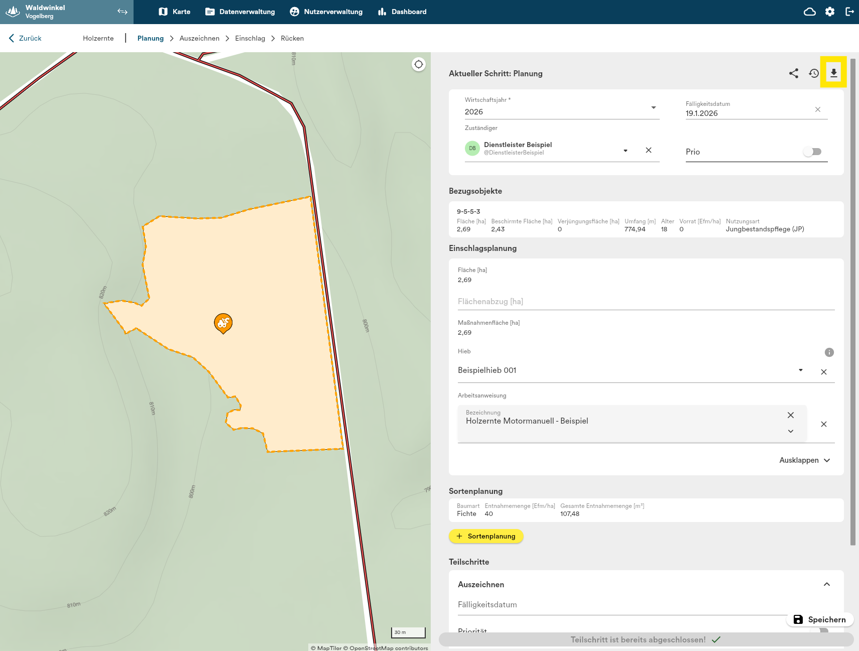 Wie kann ich eine Maßnahme zusammengefasst exportieren (PDF inkl. Karte)?
